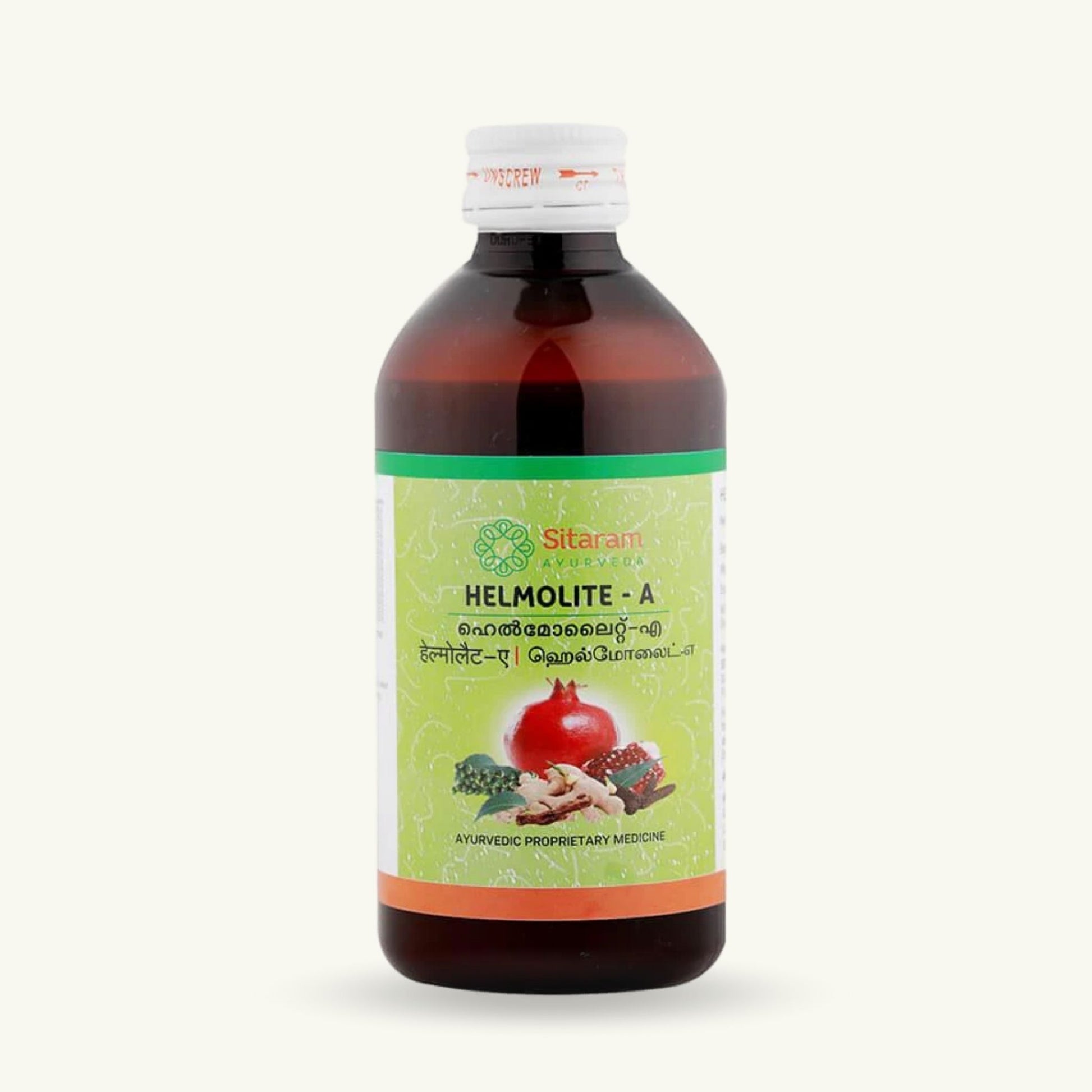 Helmolite A is a classical Ayurvedic herbal syrup crafted for children, prepared with pomegranate, khadira, neem, vayambu, ginger and the Triphala fruits. In traditional practice it is used in India during periodic cleansing routines and for general digestive care in growing children.
