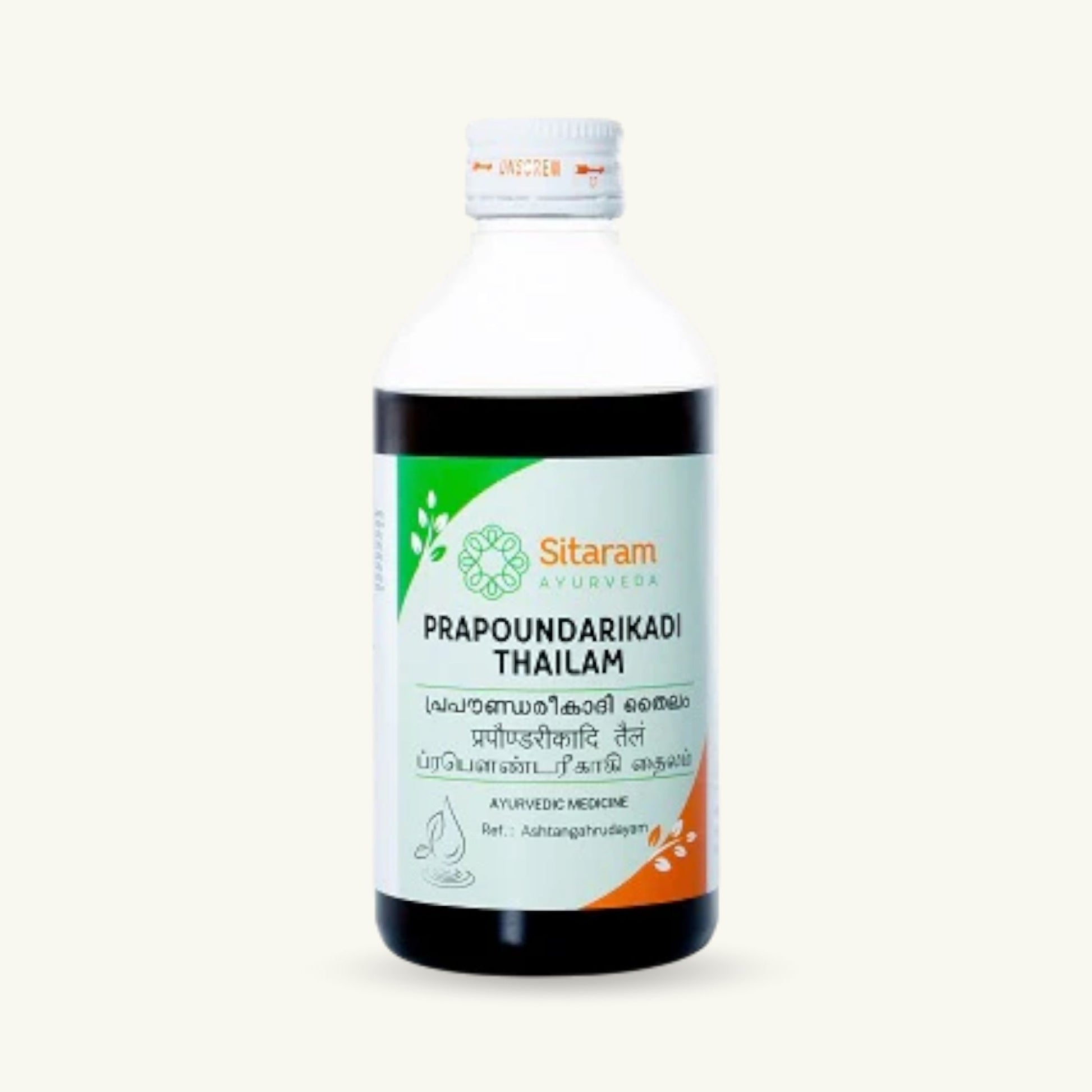 Prapoundarikadi Thailam is a classical Ayurvedic herbal oil prepared by processing roots, herbs, and plant extracts in sesame oil. It is traditionally used externally as part of daily or seasonal wellness routines.
